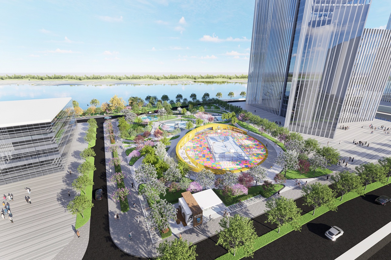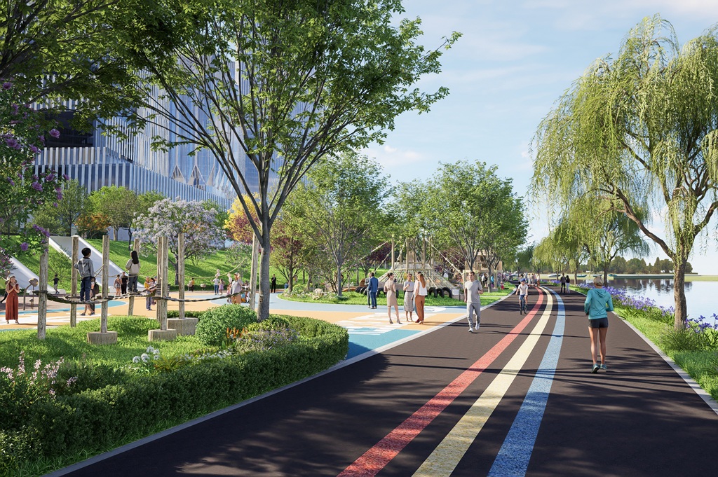 The project deeply responds to the functional positioning of Financial Island as a high-end business district and its surrounding environmental characteristics, employing a systematic design with the core philosophy of “multi-dimensional restructuring, full-system operation, and long-cycle maintenance.” The scheme between the outer ring road and the Long Lake waterfront, utilizing various vertical treatment methods such as gentle slopes, terraces, retaining walls, and boardwalks to create rich and accessible touring experiences. The core dual-loop system consists of a 3.8-kilometer outer ring slow-traffic path and a 4-kilometer waterfront leisure vitality loop, connecting over ten thematic nodes including Starry Sky Theater, Sports Park, Children's Playground, Sunset Tower,Sunrise Platform, Five Senses Garden, and Boat Dock. Eleven bicycle stopping points and four docks are set up to achieve seamless connectivity with subway stations, office areas, and water tours.
